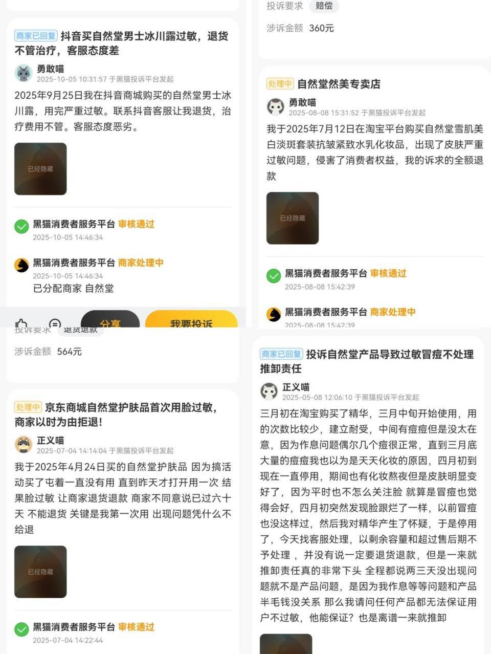 与此同时,消费者端的反馈也值得关注。在第三方投诉平台上,与自然堂相关的投诉词条累计达1627条,其中有多位消费者反映使用产品后出现过敏等不适症状。
