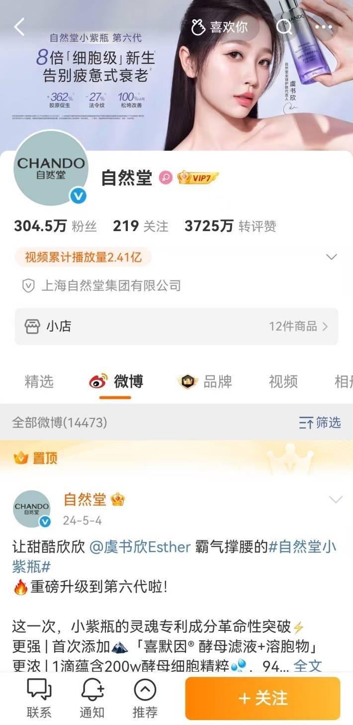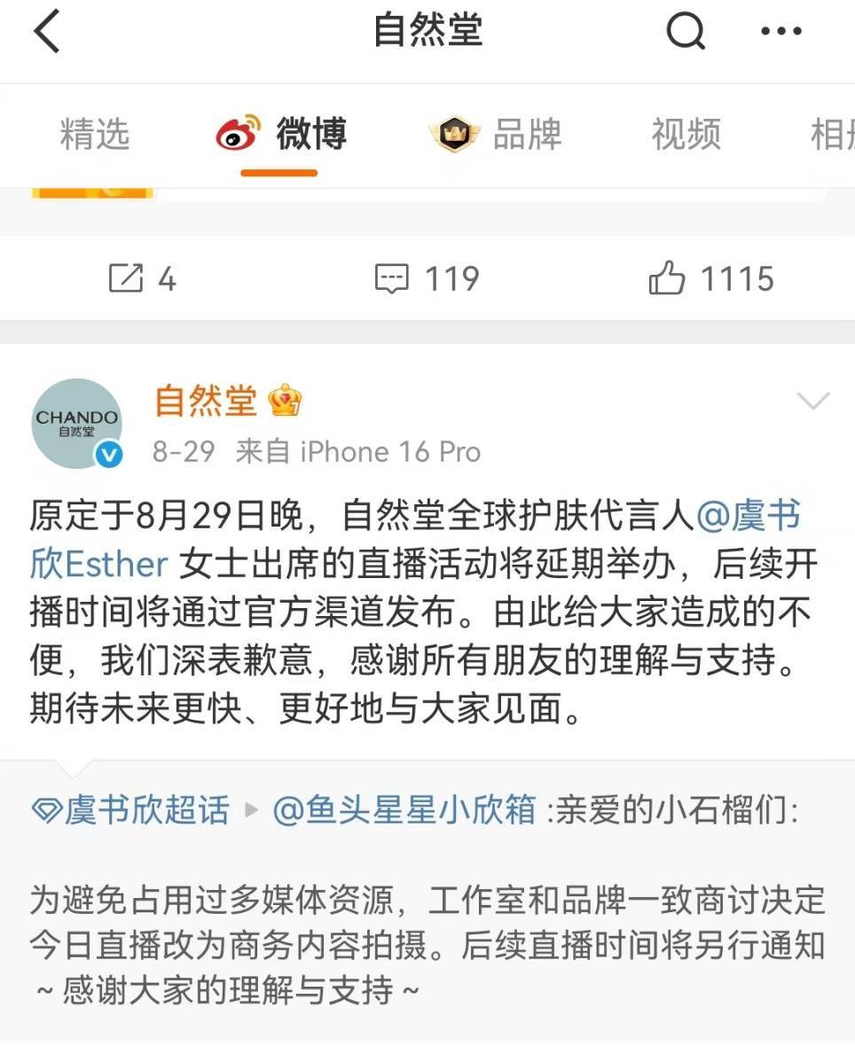 在8月29日,自然堂推迟了原定由虞书欣出席的直播活动,此后一个多月时间里,其官方微博未再更新与虞书欣有关的新物料,但目前其微博置顶物料,依旧为虞书欣相关。